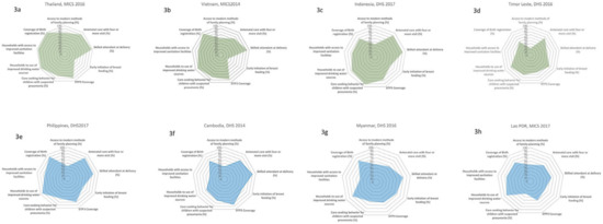 Achievement of women and children protection based on nine dimensions of maternal, newborn, and child health (MNCH) service coverage in eight selected countries. Data source: Thailand Multi-Indicator Cluster Survey (MICS) 2016, Viet Nam MICS 2014, Indonesia DHS 2017, Timor Leste DHS 2016, Philippines DHS 2017, Cambodia DHS 2014, Myanmar DHS 2016, and Lao PDR MICS 2017 (data from the reports of MICS and DHS in South East Asian countries [14]. (a) family planning (modern methods); (b) four quality antenatal care (ANC) visits; (c) skilled birth attendant rates; (d) the early initiation of breastfeeding; (e) third dose of Diphtheria-tetanus-pertussis (DTP3) immunization coverage; (f) care seeking for children with pneumonia; (g) the use of improved drinking water sources; (h) the use of improved sanitation; and coverage of birth registration.