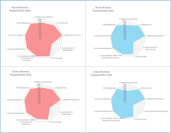 Combining two socio-economic parameters, domicile and wealth quintiles in Thailand in Figure 5 did not show much inequity. For example, there was a comparable coverage of nine MNCH services between the poorest quintiles in rural and urban areas, and there was comparable coverage of rural people who were poorest and richest.