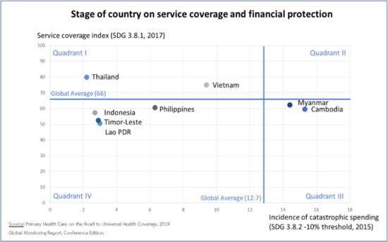 In UHC status, in Figure 6, countries were classified into four quadrants using the global average. Countries with high coverage but also a high incidence of catastrophic spending need to improve their financial risk protection. Countries with low coverage and a high incidence of catastrophic spending need to boost service provision capacity, as well as expand financial protection. Countries with low coverage and a low incidence of catastrophic spending were the poor performers. In these countries, poor households who cannot afford to pay for health services may forego required care and instead choose to die at home.