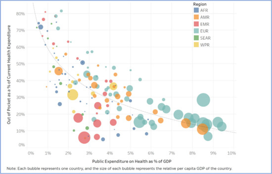 Evidence shows that out-of-pocket payment as % of current health expenditure decreases when the share of government health spending to GDP increases [32], although there is considerable cross-country variation. Higher government spending on the health of the population improves financial risk protection and reduces the proportion of out-of-pocket payment by the household. There is a steep reduction in out-of-pocket payment when government spends 2–3% of its GDP on health, see Figure 7.