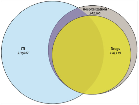 Overall, 428,093 individuals treated for SMI were identified in France for 2014. Most of these patients (75%) were identified through their inclusion in the LTI scheme for severe mental disorders (concurrently or not to a recent hospitalization for a SMI). The remaining 25% were identified through a hospitalization for a SMI within the last two years, or additionally within the last five years if they also had three deliveries of psychotropic drugs in 2014 [49] (Figure 1).