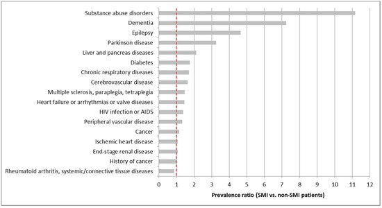 Prevalence ratio of main comorbidities between matched SMI patients and their controls without SMI.