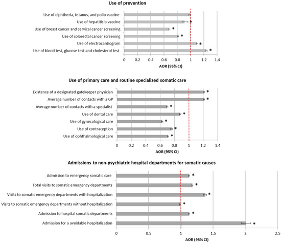 Regarding the use of primary care, it appeared as slightly more frequent in the SMI population, while on the contrary the average number of contacts with a specialist physician was far lower in this population (AOR: 0.70, 95%CI: 0.70–0.71). All use of routine specialized care was less frequent in the SMI population and differences were particularly strong for gynecological (AOR: 0.63, 95%CI: 0.62–0.64) and ophthalmological care (AOR: 0.71, 95% CI: 0.70–0.72).