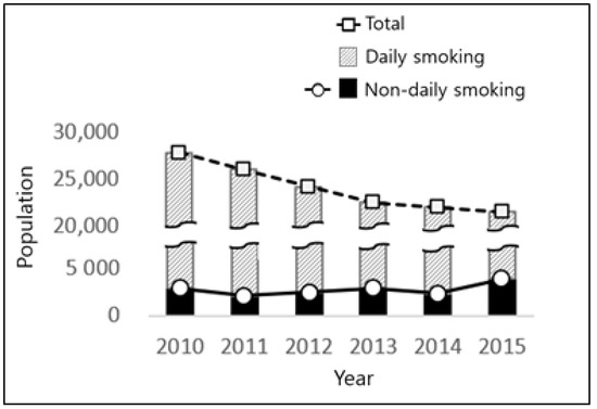 Tobacco control is being strengthened globally, and has had the effect of reducing the smoking rate. At the same time, however, Non-daily smoking (NDS; or intermittent, occasional smoking) is emerging as a new problem [1,2]. NDS accounts for 16% to 33% of all smokers in the United States [3,4], with a high rate in the youth, college students, women, and ethnic minorities [3,5,6]. In Asia, 2% to 3% of all adults and about 5% of men engage in NDS [7,8,9,10]. Still, the majority of studies on smoking in Asia have not paid much attention to this group.