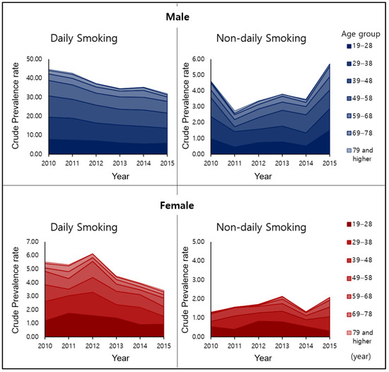 Crude prevalence of smoking by age and sex from 2010 to 2015.