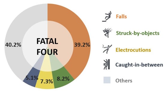 The integration of innovative technologies in the field of information and communication technology (ICT) is rapidly transforming conventional construction into smart construction. Nonetheless, the nature of the construction process makes it prone to risks and accidents; moreover, innovations in the construction sector have given rise to new safety issues. According to recent public reports, construction is one of the most hazardous occupations with considerably higher number of work-related injuries and fatal accidents than other industries [1,2,3]. The Occupational Safety and Health Administration (OSHA) reports show that worker fatalities in the construction industry in 2017 accounted for 20.7% with 971 cases. Indeed, among the hazards that account for injury and death, OSHA has labeled “Fatal Four” as the leading causes of workplace deaths, which are responsible for more than 60% among the construction worker deaths, by the US Bureau of Labor Statistics (BLS) reports. These four main hazards consist of falls, struck-by-object, electrocutions, and caught-in-between [4]. Figure 1 shows the proportion of accidents attributed to each category in the Fatal Four.