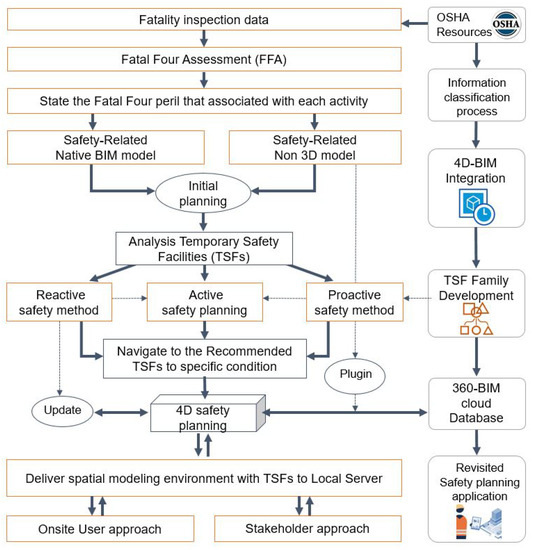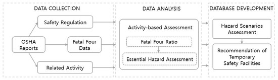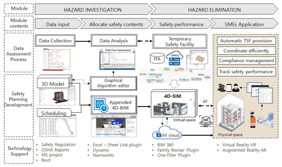 - Hazard investigation module. This module consists of the following two-stage process: data input process and allocating safety contents process. The input data process is a preparation of project 3D model and 2D data such as project schedule and the Fatal Four data collected from the OSHA website. Following this, the allocating safety contents is a procedure of analyzed and assessed Fatal Four data. Concurrently, the designated tools for 2D and 3D data exchange such as a graphical algorithm and BIM were employed for developing the linking of databases for the next module.