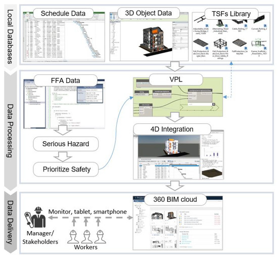 The process of data procedure in the WPT system includes three stages: local database preparation, data processing, and data delivery to users. The WPT system architecture is presented in Figure 5. Each company has their own local databases, which are obtained from specific project information and TSFs library, which is variously provided by the supplier on the construction market. The data processing stage utilize FFA data to identify a serious hazard and select prioritize safety prevention in construction sequences. Regarding the BIM attribute addition, Dynamo can recognize and specify the time for invoking the model components. Accordingly, the coordinated 3D-BIM building model and TSFs library were extracted in real-time. This function enables access to the Revit .NET API application programming interface, which allows programming with any .NET compliant language including VB.NET, C#, and C++/CLI. It permits the user to query data, change element properties, and add/modify certain components directly from the visual environment. The last stage allows updating 4D-BIM-based data from the system to the company network through the cloud server by using the 360-BIM cloud. This platform allows users access readily to WPT system from anywhere by personal devices such as tablets or mobile phones.