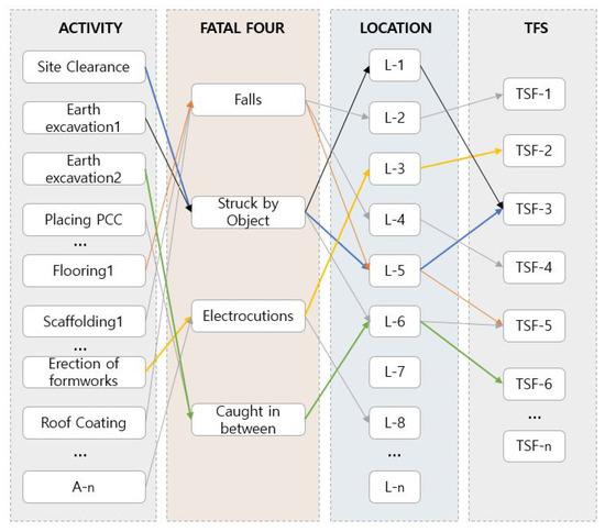 In order to guarantee workplace safety, the participants, including managers and workers, have the responsibility to understand and meet several safety requirements. Navigating the TSFs system to specific work activity in a 4D-SIM framework depends on the relationships between three factors, i.e., the relationship between activity and FFA result, and that between the FFA result and subjects (location and space). The available TSFs that satisfy both these two linking factors are recommended for accident prevention. Figure 7 illustrates the relationship of activity-based FFA and TSFs recommendation. Consequences, the provision of both the schedule-based model and the activity-based essential hazard producing the prioritized safety protections in the work sequence. The interconnected workflows within these relationships were essential for developing the workspace planning for TSFs.