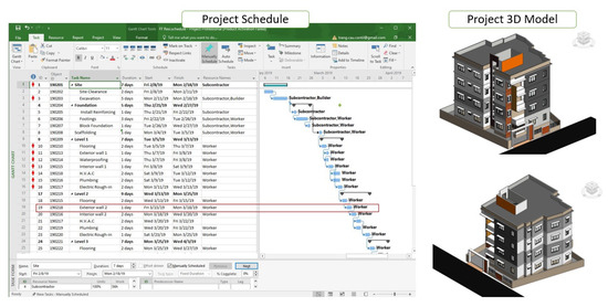 The field safety case study was performed during the construction of a private residential building project with a total area of 320 sq. m and construction density of 60 percent. The example given in this case study is BIM model of a five-story building developed in Autodesk Revit software. It is a complete model with architectural and structural elements (without mechanical, electrical, and plumbing (MEP) equipment and furniture), and the project schedule was planned for six months (as shown in Figure 8). The construction of the exterior wall involves several activities including layout, material handling, scaffolding, block laying, block cutting, grinding, shoring, and grouting [19].