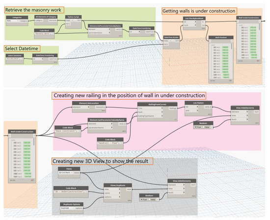 The Dynamo script will depend on the progress of the schedule to automatically calculate and propose safety measures. A safety system that employs 3D BIM related to the activity of block laying was developed. The system allows synchronization of the model data back and forth between Autodesk Revit and the schedule spreadsheets. In this process, the schedule, activity, and the corresponding safety information ID are set up and loaded to the system database. The database contains Fatal-four-related fatality cases, the activity-based essential hazard, hazard scenario, and corresponding safety measures. Combining with the developed parameter model in Revit, the design team employs Dynamo to read available schedule data of exterior walls from MS Excel format. This VPL will automatically retrieve and integrate data to acquire information about the by-floor construction progress of architectural walls (includes exterior and interior walls, excludes structural walls and other walls). The user can choose any work dates in the schedule to estimate the needed tasks and continue using Dynamo to distinguish between the constructed walls and those under construction.