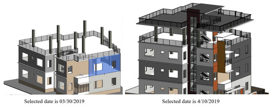 After retrieving all walls that are not yet constructed, a new railing system is constructed at the positions of these walls. The new 3D view was also created to show the TSF system in the Revit model. Figure 12 illustrates the comparison of the corresponded temporary railing system on the selected dates of 30 March and 10 April. According to the schedule, the external walls at floor elevation 3, 4, and the roof have not been constructed; therefore, temporary railing systems are installed at these elevation levels. If the selected date is changed, Dynamo will automatically create a new 3D view in Revit to simulate the temporary safety systems at that time.
