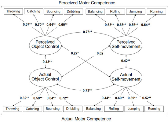 Relations between the factors of actual and perceived motor competence (MC) (model 1). * Significant differences at the level of p ≤ 0.05; ** Significant differences at the level of p ≤ 0.001.