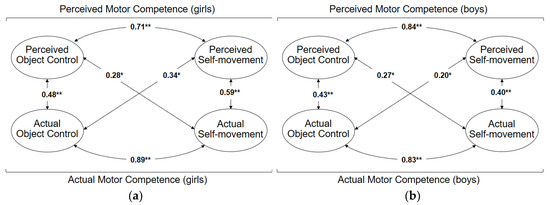 Relations between the factors of actual and perceived MC (model 3) (a) for girls; (b) for boys. * Significant differences at the level of p ≤ 0.05; ** Significant differences at the level of p ≤ 0.001.