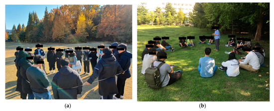 Campus forest therapy program intervention. (a) forest folk dance; (b) lecture on stress management.