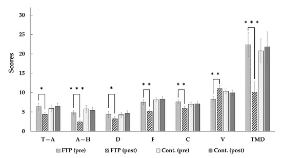 The results of paired t-test analyses of Profile of Mood States (POMS) scores. T–A = tension–anxiety; C = confusion; A–H = anger–hostility; D = depression; F = fatigue; V = vigor; TMD = Total Mood Disturbance. FTP = Forest Therapy Program Group; Cont. = Control Group. *** p < 0.001, ** p < 0.01, * p < 0.05.