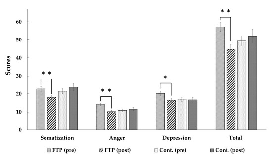 The results of paired t-test analyses of Modified Form of the stress response Inventory (SRI-MF) scores. FTP = Forest Therapy Program Group; Cont. = Control Group. ** p < 0.01, * p < 0.05.