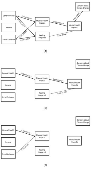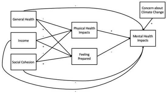 Our analysis of hypothesized pathways (Figure 1) is informed by prior literature on how forms of human capital (e.g., general health, physical health), financial capital (e.g., income), and social capital (e.g., social cohesion) may help people cope with or adapt to the consequences of climate-related weather extremes [20,26,30]. For exploratory purposes, we also include two cognitive variables that may relate to mental health impacts: feeling prepared for extreme weather (preparedness) and concern about climate change.