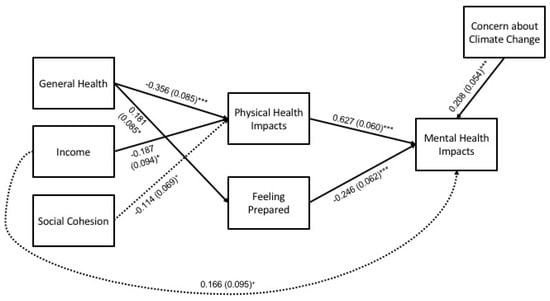 Path model for mental health impacts during winter extremes (N = 397). Statistically significant pathways are shown with standardized estimates and standard errors (SEs) in parentheses. Statistical significance levels are: + p < 0.10, * p < 0.05, and *** p < 0.001.