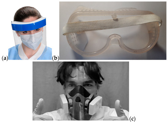 Example of personal protection equipment: (a) full face shield (Medical Supplies and Equipment Co., Katy, Texas 77450, USA); (b) construction worker goggles Archimedes 91,862 (Technoplast Ltd., St. Petersburg, Russia); (c) full face shield (FabLab, Skolkovo Institute of Science and Technology, Moscow, Russia)—near to invisible.