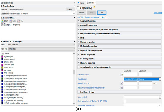 The constraint on transparency significantly reduces the number of candidates from more than 4000 down to 197 as shown in the Figure 2a. Candidate materials passing the “transparency” filter represent different classes of materials (Figure 2b) including fibers and particulates, and technical ceramics like sapphire and quartz, and various glasses. Ceramics and glasses will be further excluded because of brittleness and obvious technological difficulties in the application of shaping processes. The limitation on material class (polymers and elastomers are passing this filter) further cuts down the number of candidates (Figure 2c)—only 130 materials are considered at the ranking stage.