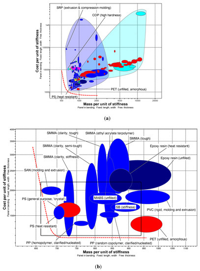 Materials selection for transparent medical face masks. Ranking stage: (a) 130 candidates; (b) 16 candidates (red—optical quality; blue—transparent). (Charts and data from CES EduPack 2019, Granta Design Limited, Cambridge, UK, 2019 [15]).
