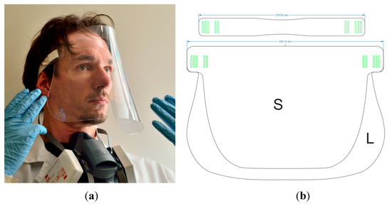 The price of professional industrially manufactured full face shield reaches tens of USD from local suppliers in USA and UK, while lead time of several weeks for Chinese products with the price of units of USD per 1 pcs is not acceptable during a pandemic (a short analysis of current prices, designs and materials are presented in Supplementary Materials S1). Relatively cheap (units of USD) and easily affordable protection masks (exemplified in Figure 1b) made from polycarbonate glass are designed for the protection against impact of metal and stone debris, making it heavier, while their optical characteristics do not satisfy the end user requirements in the medical context, since the clarity and transparency for fine hand operations are modest. The weight of commercially available products may reach 380 ± 80g.