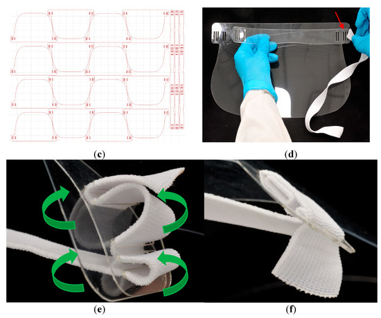 Devised full face transparent shield: stages of fabrication: (a) ready product; (b) pattern for laser cutting of L vs. S size; (c) laser cutting S size template example less than 8 min total; (d,e) assembling of forehead strip and front visor together with fabric elastic band; (f) adjusted band length to maintain comfort pressure.