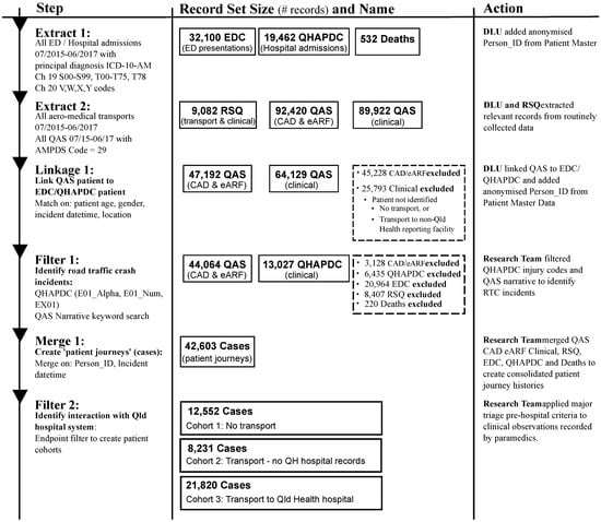 Case information from each data source was linked to records in the EDC, QHAPDC and Births-Deaths-Marriages systems and an identifier was assigned by the Data Linkage Unit to indicate which records belong to the same event (road trauma patient transport).