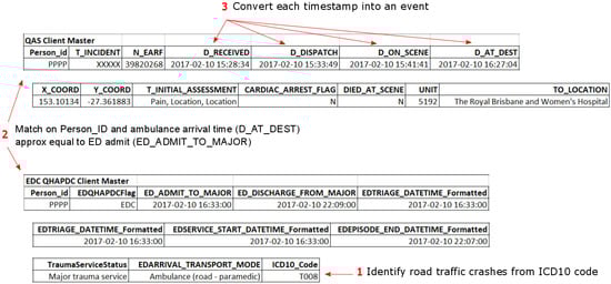 It was also necessary to filter the resulting linked record set to remove incidents that did not represent road traffic crashes. The QAS data extract included transport related incidents (AMPDS code = 29). As such this extract included a number of incidents relating to boats or jet-skis, BMX bikes, etc. The record set was filtered to include only incidents representing road traffic crashes (RTCs) by searching for keywords in the T_NARRATIVE field commonly used by paramedics when attending RTCs. To be inclusive, the ICD-10-AM principal diagnosis codes of the QHAPDC data set were searched to identify injuries related to road traffic crashes. Finally, the patient journeys were split into three separate cohorts for analysis based on whether the patient required transport, and if so, did the transport result in hospitalisation. Figure 1 gives details of the numbers of records from each data source that was used in preparation of the study data and the steps involved in generating the event logs used in the process mining analysis. Figure 2 is an example of related records from the QAS and ED data sets which shows (1) how hospital presentations related to road traffic crashes were identified, (2) how QAS records were matched with ED records (same approach for QHAPDC and RSQ records) and (3) how events were created from waypoint timestamps. The corresponding case from the event log is illustrated in Figure 3.