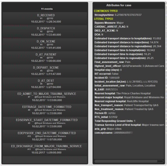 A summary of the event log is shown in Table 1 and a dictionary of the meanings associated with activity labels is given in the Appendix A (see Table A1). It should be noted that we have considered the patient journey to include all emergency services and relevant hospital events from the initial call to the QAS emergency call centre up to a maximum of eight days following the emergency call. We took relevant hospital events to those EDC or QHAPDC events with less than 24 h between the completion of one and the beginning of the next activity up to a maximum of 8 days. An extract of the log (single case from Cohort 3) is shown in Figure 3. The extract shows events and case attributes. For this case, the patient was transported (by QAS) to a Qld Health Facility (Royal Brisbane and Women’s Hospital). Even though the patient met criteria for transport to a major trauma service (Bypass Measure = Major) and the patient was transported to a major trauma service (trauma Service Level of first hospital = Major trauma service), the Revised Trauma Score (RTS = 9.5102) being towards the upper end of the scale, is associated with a better chance of of survival. The patient was not admitted to the hospital (Hospital stay (days) = 0) and was treated, then discharged from the emergency department.
