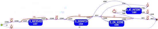 The (automatically) discovered process model for this cohort (from the Direct Follows Inductive visual Miner []) is shown in Figure 5 where after an emergency call is received, an ambulance is dispatched, the ambulance arrives on the scene or/and at the patient and no other event has been recorded for these cases. Cohort 1 comprised 40 trace variants with the median and mean case duration as 10.1 and 16.1 min respectively.