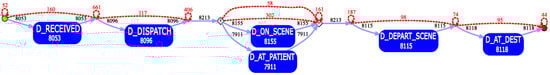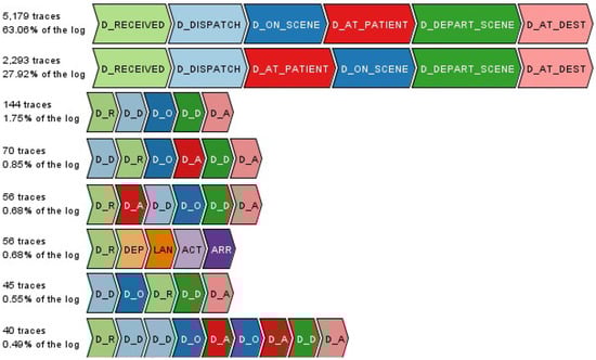 The process model of this cohort can be seen in Figure 6 which depicts that after a call for ambulance is received, an ambulance is dispatched, it arrives on the scene/at the patient, the patient is then loaded or triaged at the scene, the ambulance then departs from the scene and finally arrives at the destination recorded as the last activity D_AT_DESTINATION. Cohort 2 comprised 122 trace variants with median and mean case duration as 53.7 and 61.3 min, respectively. Figure 7 illustrates some of this cohort’s trace variants.