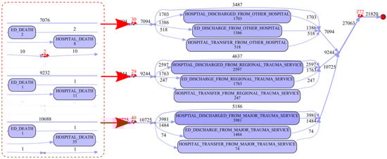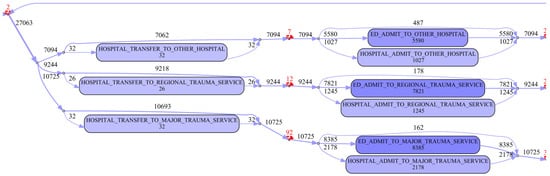 - Durojaiye, A.B.; McGeorge, N.M.; Puett, L.L.; Stewart, D.; Fackler, J.C.; Hoonakker, P.L.; Lehmann, H.P.; Gurses, A.P. Mapping the Flow of Pediatric Trauma Patients Using Process Mining. Appl. Clin. Inform. 2018, 9, 654–666. [Google Scholar] [CrossRef] [PubMed]