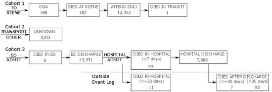 | ED_ADMIT_TO_[TSL] | Patient admitted to emergency department of trauma service level: TSL = MAJOR, REGIONAL, or HOSPITAL |