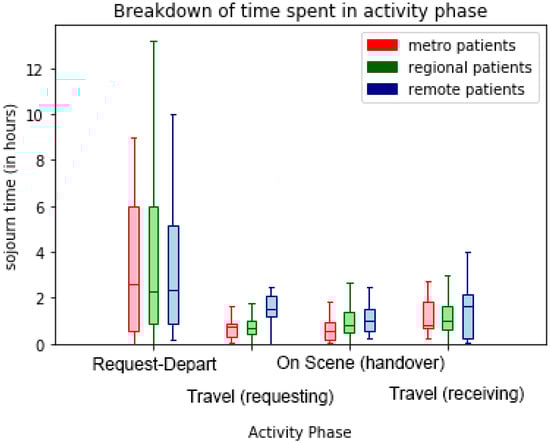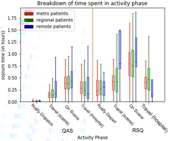 The box-and-whisker plots of sojourn times for transport phases in Figure 13, Figure 14 and Figure 15 visualise the performance variations across process phases by quartile of the respective patient cohorts. In Figure 13 the effect of remoteness is clearly evident on travel times with remote patients involving longer travel-to/from-scene times (particularly for RSQ (air-ambulance) travel-to-scene times). Further differences are evident in the comparative on-scene times between ground (QAS) and air (RSQ) ambulance crews. This is likely reflective of the time taken to stabilise a patient prior to take-off (as some critical interventions are avoided once in the air), and the time required to appropriately package the patient for air travel.