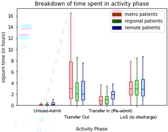 In this section we report on results of a comparative process and performance analysis in which Cohort 3 was further sub-divided according to initial transport destination. Cases were tagged as ‘metro’, ’regional’ or ‘remote’ using the Accessibility Remoteness Index of Australia (ARIA) (https://www1.health.gov.au/internet/publications/publishing.nsf/Content/ARIA-Review-Report-2011~ARIA-Review-Report-2011-2~ARIA-Review-Report-2011-2-2-3) data attribute associated with each Qld Health hospital/facility. The log was re-coded to represent major transport and care segments: