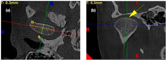The exemplary lines, points, and angles in the TMJ CBCT scans used for measurements regarding the morphology of the mandibular condyle. (a) Morphology of mandibular condyle in the axial view: /a/ condylar A-P dimension, /b/ condylar width. (b) Shape of condyle head in the coronal view: condyle’s superior surface view assessment.