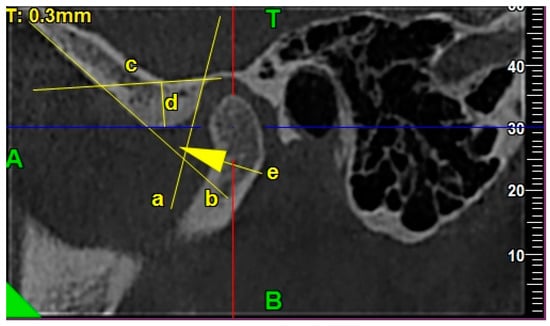 The exemplary lines, points, and angles in the TMJ CBCT scans used for measurements regarding the morphology of the glenoid fossa in the sagittal view: /a/ PE line, /b/ AT line, /c/ glenoid fossa basal line, /d/ glenoid fossa depth, and /e/ glenoid fossa divergence angle.