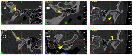 - Yasa, Y.; Akgul, H.M. Comparative cone-beam computed tomography evaluation of the osseous morphology of the temporomandibular joint in temporomandibular dysfunction patients and asymptomatic individuals. Oral Radiol. 2018, 34, 31–39. [Google Scholar] [CrossRef] [PubMed]