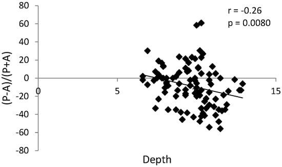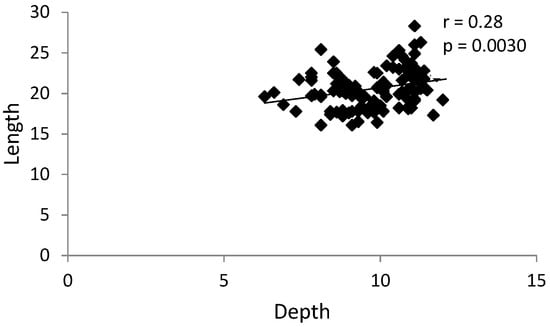 There were statically significant correlations in the TMJ reciprocal clicking group: positive (r = 0.32, p = 0.0010) between condylar anteroposterior dimension and sagittal position of the condyle in the glenoid fossa (Figure 10), and negative (r = −0.26, p = 0.0080) between glenoid fossa depth and sagittal position of the condyle in the glenoid fossa (Figure 11). These correlations were not observed in the control group (without TMJ reciprocal clicking).