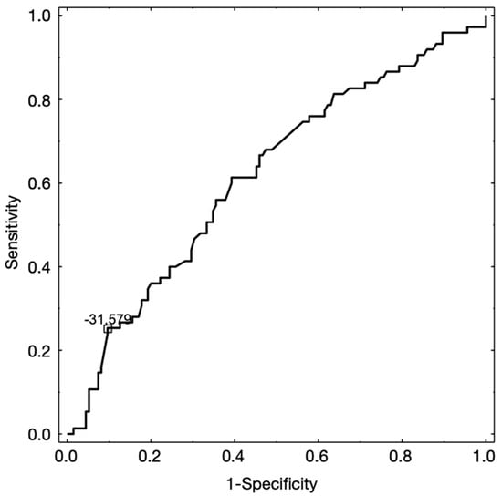To assess the probability of the presence of the reciprocal clicking regarding the sagittal position of the condyle in the glenoid fossa, the ROC analysis was performed. The value of (P − A) / (P + A) = −31.579 was the cut-off point, which distinguished the reciprocal clicking and lack of it. The (P − A) / (P + A) with the value below −31.579 represented reciprocal clicking. The measured cut-off point was characterized by the sensitivity of 25.3%, and specificity of 90.4%. The value of area under the curve was: AUC = 0.62 (95%CI [0.54;0.70]), p = 0.0034). Figure 12 presents the diagram for receiver operating curve (ROC) analysis.