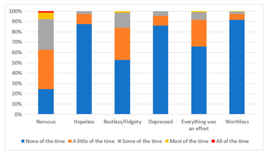 The average K6-score was 2.7 (SD = 2.6). Figure 1 presents the K6 profiles in detail. In particular, nervous, restless/fidgety, and “everything was an effort” were the three most frequently reported aspects of psychological distress among the participants.