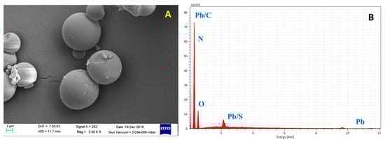 HHTB, with a diameter from 2 μm to 15 μm (Figure 1A), was spherical and easy to reunite. After soaking in the Pb ion solution, it was found that Pb was successfully adsorbed on HHTB (Figure 1B). FT-IR spectra were employed to investigate the changes of functional groups and the results are shown in Figure 2A. It can be seen that the broad adsorption peak at 3430 cm−1 (a) was owing to the stretching vibration of hydroxyl, and the peak at about 2800 cm−1 may be due to the stretching vibration of -CH2-. Meanwhile, the characteristic IR adsorption peak at 1630 cm−1 and 1100 cm−1 could be a result of the carbonyl stretching vibrations and carboxylic acid bending vibration, respectively [30,31]. What is more, from Figure 2B it can see that there was only one obvious peak, and both of them were around 1600 cm−1. Compared with Figure 2A, it is further demonstrated that it may be a carbonyl group. These results indicated that the as-prepared samples were mainly composed of carbon, hydrogen and oxygen and were rich in carbon-oxygen functional groups, which may be the binding sites of heavy metal ions [32] (Figure 2A,B). After adsorption Pb2+, the stretching vibration peak of C=O moved to 1620 cm−1, indicating the site of the carboxyl functional group (-COOH) on the HHTB was the main adsorption reaction site.