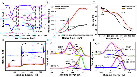 (A) FT-IR spectrum before (a) hydrothermal, (b) calcined and after (c) HHTB adsorption of Pb; (B) raman analysis of materials before and after HHTB adsorption of Pb; (C) thermogravimetric analysis of materials treated with hydrothermal and muffle furnaces; XPS spectrum: (D) full spectrum of XPS before and after HHTB adsorption; (E) C1s orbital energy level before and after HHTB adsorption; (F) O1s orbital energy level before and after HHTB adsorption.