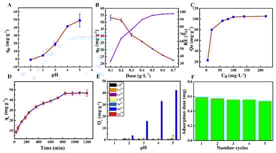Effect of pH (A), adsorbent dose (B), concentration of Pb ions (C), adsorption kinetics of Pb2+ onto HHTB (D) and coexisting ions on the adsorption (E); HHTB to Pb2+ adsorption dose and recycling (F).