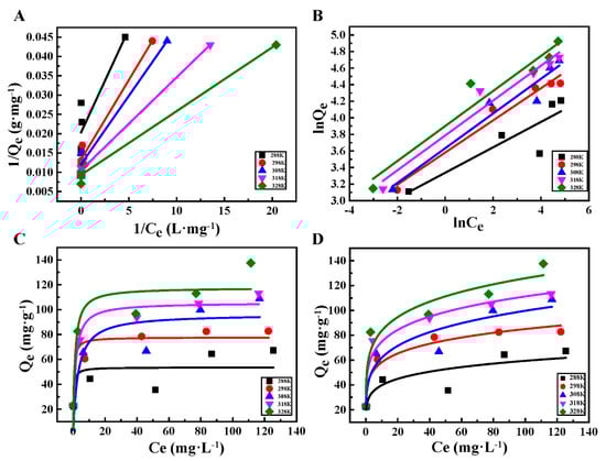 (A,C) Linear and nonlinear fit of the Langmuir model; (B,D) linear and nonlinear fits of the Freundlich model.