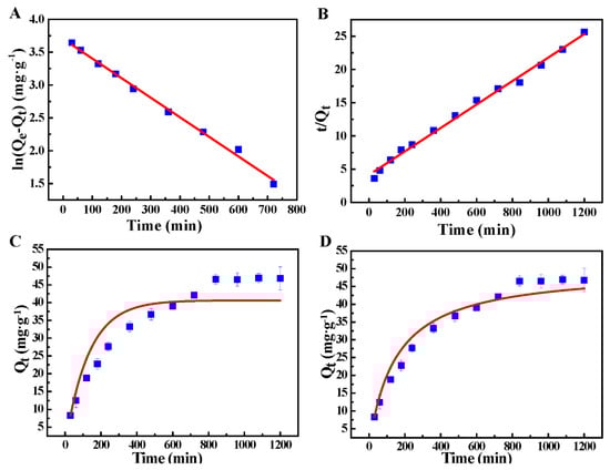 (A,C) Linear and nonlinear fitting plots of pseudo-first order kinetic models; (B,D) linear and nonlinear fitting plots of pseudo-second order kinetic models.