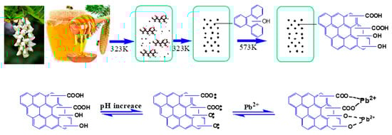 In recent years, with the rapid development of industrialization and urbanization, a considerable part of heavy metals are directly discharged into nature and cause severe environmental pollution all over the world. Heavy metals can be enriched in biological organs through the food chain, thus endangering human health [1,2] and breaking the balance of the ecological environment [3]. Lead (Pb) is a kind of heavy metal that may cause serious harm to the human body through affecting the function of the human nervous system, especially Pb to physical development disorders of children [4]. According to the survey, since 1994 the concentration of Pb in Chinese children’s blood has dropped significantly from 92.90 μg L−1 to 63.15 μg L−1 but is still much higher than that of U.S. children in 2010 (13 μg L−1). Pb is widely found in industrial wastewater and sludge such as pigments, textiles and electroplating. Especially in the wastewater discharged from the lead-acid battery industry, the Pb content reaches 200–500 mg L−1, which is much higher than that of Pb and zinc industrial pollutants (1 mg L−1) and drinking water standards (0.01 mg L−1). Therefore, the treatment of Pb pollution in wastewater has attracted much attention for scientists. In recent years, domestic and foreign scholars have conducted a lot of research and developed a variety of effective treatment techniques, such as chemical precipitation [5], ion exchange [6], electrolysis [7], biosorption [8,9,10,11], membrane separation [12], photo reduction and other treatment methods [13,14,15,16]. Biosorption has attracted more and more attention because of its wide source of raw materials, low cost and environmental friendliness [17,18]. Biochar is a highly aromatic solid material obtained by pyrolysis and carbonization of biomass materials under a certain temperature [19]. It has excellent characteristics of good pore structure, rich oxygen-containing functional groups on the surface [20] and strong ion exchange [21] to possess good physical and chemical adsorption capacity [22,23,24,25,26]. Biochar is produced through four main thermochemical routes: (i) torrefaction, (ii) pyrolysis, (iii) hydrothermal carbonization and (iv) gasification and has wide applications, such as soil amendment, environmental remediation, energy storage, composites, and catalyst production [27,28]. In these thermochemical methods, hydrothermal carbonization is useful for the improvement of properties of products [29]. The raw material for making biochar has always been a hotspot for researchers. Honey, as a natural renewable resource, has a structure rich in hydroxyl groups, and the hydroxyl groups of biochar play an important role in its application. According to a survey, the world’s honey output was about 1.863 million tons in 2019, with a steadily increasing trend. The more mature the honey production process, the lower the price will follow. Furthermore, there is much more waste in honey factories, which is relatively cheap. The price of honey is indeed more expensive than some other biological precursor materials, but it is also one of the potential precursors for making biochar.