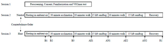 Following instrumentation with sensors, first baseline measurements (B1) were obtained while participants sat quietly for 15 min in an ambient temperature (25.0 °C, 40% RH). Upon completion of B1, subjects entered the environmental chamber and second baseline measurements (B2) were obtained, followed by a 30-min resting period under a given condition and dependent variables were measured (B3). After the 30-min resting period, subjects performed two consecutive simulated work activities with two repetitions of each activity. The simulated work activities consisted of 10 min walking (AE) and 15 lifts of a 22.7 kg sandbag (AN). The 10 min of walking on the treadmill was performed at an intensity of 70%−75% of their maximum heart rate. If HR exceeded the target HR range for more than one minute, the treadmill speed and incline were adjusted to maintain the same relative intensity for each participant. This adjustment allowed for direct comparisons of psychophysiological alternation between conditions under similar relative intensities of exercise although the workload is absolute in nature. Furthermore, this adjustment allowed subjects to complete the experimental trials and ensure subject safety.